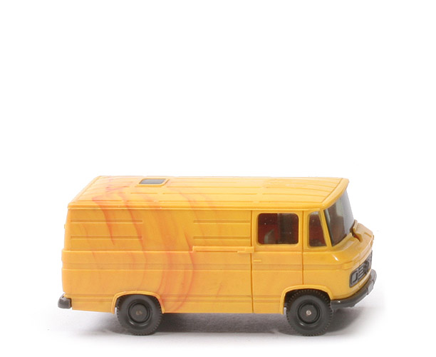 Farbe Karosserie | gelb mit roter Melierung | Verglasung | getönt | Inneneinrichtung | ca. graubeige | Lenkrad | ohne | Chassisfarbe | anthrazit | Platte zur Achshalterung | anthrazit | Bodenprägung | Wiking Germany 27 | Beschriftung | ohne | Bemalung | ohne | Räder | anthrazit, 9 mm (groß) |