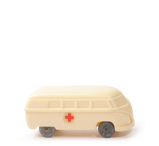 Achsen | Rollachser | Karosserie oben | cremeweiß | Seite | mit 4 Seitenfenstern | Front | VW Emblem | Karosserie unten | cremeweiß | Bodenprägung | WM (im Kreis) | Blaulicht | ohne | Bemalung Scheinwerfer | ohne | Bemalung Stoßstange vorne | ohne | Bemalung Heck | ohne | Scheibensilberung | ohne | Beschriftung | Rotes Kreuz | Beschriftung Art | kreisrundes Abziehbild | Räder Typ | 8 mm, ohne Profil | Räder Farbe | ca. basaltgrau |
