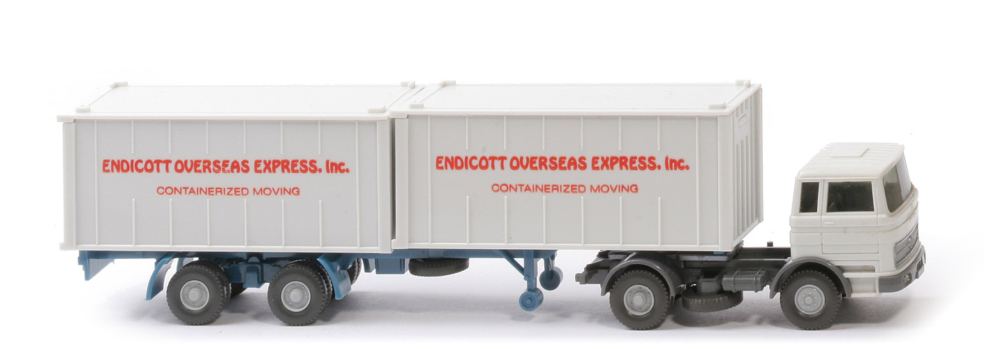 | Zugmaschine | Kabine oben | altweiß | Kabine unten | altweiß | Streifen | ohne | Verglasung | getönt | Inneneinrichtung | ca. basaltgrau | Lenkrad | ohne | Grill | silbern | Stoßstange, Radlauf vorn | basaltgrau | Chassistyp | neu | Chassisfarbe | basaltgrau | Radlauf hinten | basaltgrau | Reserverad | unter Chassis | Sattelpfanne | für großen Königsbolzen | Räder | 12mm, Profil grob | Felgen | silbergrau | | Container | Art | 2 x 20 ft gerippt | Dach | altweiß | Korpus | altweiß | Türen | altweiß | Beschriftung | Endicott ... (s. Foto) | Beschriftung Art | Druck | | Auflieger | Farbe | azurblau | Unterfahrschutz | ohne | Königsbolzen | stark | Räder | 12mm, Profil grob | Felgen | silbergrau |