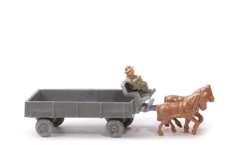 Räder | Drahtachser | Pritschentyp | ohne Querverbretterung | Farbe Pritsche | basaltgrau | Deichselrest | ohne | Pritschenboden | mit Struktur | Zughaken | integriert, nach unten | Deichsel/Kutschbock | grau | Quersteg Deichsel | mit | Farbe linkes Pferd | ca. ockerbraun | Farbe rechtes Pferd | ca. ockerbraun | Kutscher Typ | Mütze | Kutscher Farbe | metallisches felsgrau | Kutscher Bemalung | Gesicht, Hände | Räder | ca. staubgrau |