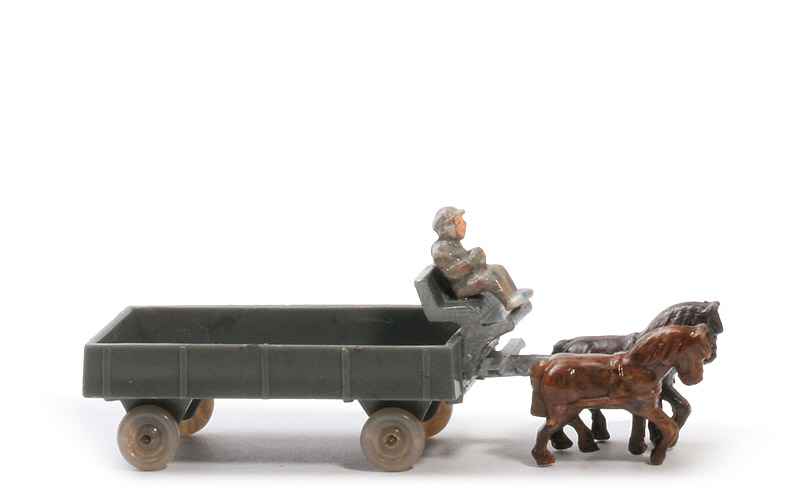 Räder | Drahtachser | Pritschentyp | ohne Querverbretterung | Farbe Pritsche | betongrau | Deichselrest | mit | Pritschenboden | glatt | Zughaken | ohne | Deichsel/Kutschbock | silbern | Quersteg Deichsel | mit | Farbe linkes Pferd | ca. schokobraun meliert | Farbe rechtes Pferd | misch dunkles lehmbraun | Kutscher Typ | Mütze | Kutscher Farbe | mischfarben | Kutscher Bemalung | Gesicht, Hände | Räder | transparent hellgrau |