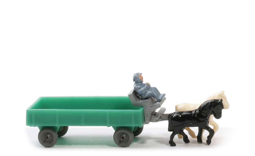Räder | Drahtachser | Pritschentyp | ohne Querverbretterung | Farbe Pritsche | dunkles blassgrün - wunderbar glasig | Deichselrest | mit | Pritschenboden | mit Struktur | Zughaken | integriert, nach unten | Deichsel/Kutschbock | ca. silbern | Quersteg Deichsel | mit | Farbe linkes Pferd | helles cremweiß | Farbe rechtes Pferd | schwarz | Kutscher Typ | Mütze | Kutscher Farbe | misch, helles mattgraublau | Kutscher Bemalung | Gesicht, Hände | Räder | transparentes staubgrau |