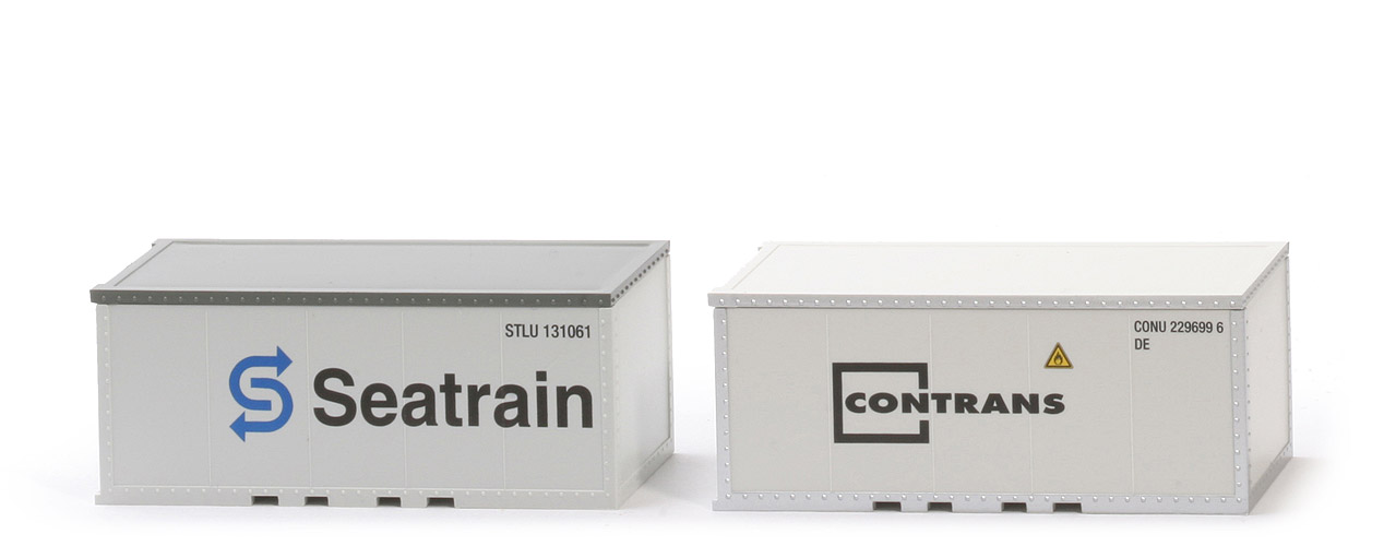| | Container 1 | | Größe | 20 ft | | Typ | Plywood-Container | | Farbe Korpus | altweiß | | Farbe Dach | dunkles zementgrau | | Farbe Türen | dunkles zementgrau | | Bodenprägung | neues WIKING-Logo, Germany | | Beschriftung | Logo kobaltblau, "Seatrain" schwarz | | Containernummer | "STLU 131061" | | Beschriftung Art | Druck | | | Container 2 | | Größe | 20 ft | | Typ | Plywood-Container | | Farbe | grauweiß, Ränder der Seiten silbern schabloniert | | Bodenprägung | neues WIKING-Logo, Germany | | Beschriftung | "Contrans" in Logo, Gefahrensymbol F (schwarz/gelb) | | Containernummer | "CONU 229006 8 DE" | | Beschriftung Art | Druck |