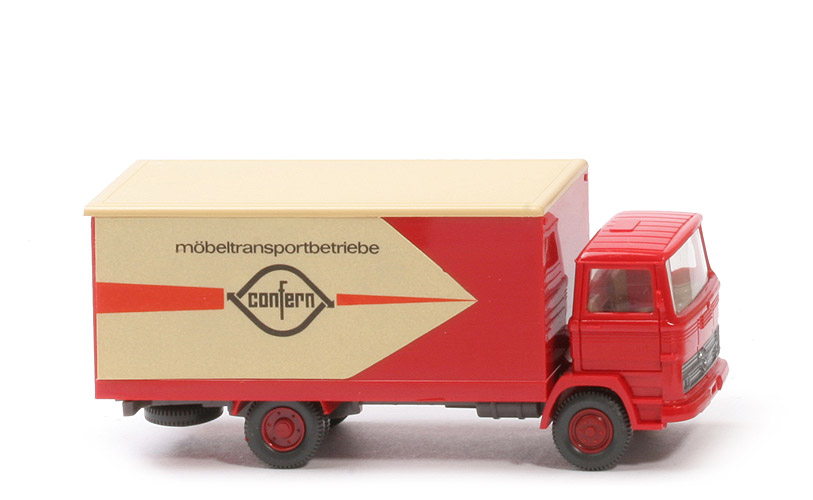Farbe Kabine | rot | Spiegel | mit | Verglasung | klar | Grill | silbern eingesetzt | Bemalung vorne | ohne | Inneneinrichtung | 2 Sitze, Motorblock | Armaturenbrett, Lenkrad | mit | Farbe Innenrichtung | ca. hellolivgrau | Chassis Farbe | staubgrau | Chassis Bodenprägung | GERMANY, WM | Zughaken | ohne, entfernt | Reserverad | hinten unter Chassis gesteckt | hinterer Kotflügel | rot | Bemalung Rückleuchten | ohne | Aufbau Typ | hoher Koffer | Farbe Koffer | rot | Farbe Türen | rot (!) | Farbe Kofferdach | hellbeige | Koffer Bodenprägung | WIKING, Berlin-W | Beschriftung | confern ... (s. Foto) | Beschriftung Art | Papieraufkleber | Räder | 11mm, 2-teilig | Felgen | 6-Loch, hellbraunrot |