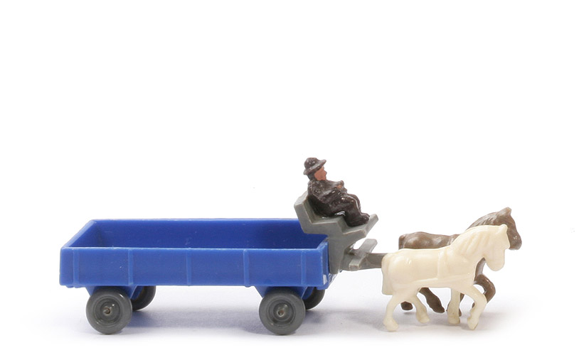 Räder | Drahtachser | Pritschentyp | ohne Querverbretterung | Farbe Pritsche | ultramarin | Deichselrest | mit | Pritschenboden | mit Struktur | Zughaken | integriert, nach unten | Deichsel/Kutschbock | ca. platingrau | Quersteg Deichsel | mit | Farbe linkes Pferd | ca. blassbraun mit Melierungen | Farbe rechtes Pferd | ca. cremeweiß | Kutscher Typ | Hut | Kutscher Farbe | dunkles schokobraun uni | Kutscher Bemalung | Gesicht, Hände | Räder | ca. basaltgrau glasig |