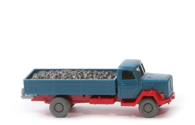 Farbe Kabine | azurblau | Verglasung | getönt | Bemalung vorn | Scheinwerfer silber | Chassis Farbe | rot | Chassis Art | Version 3 | hinterer Chassisbereich | geschlossen | Chassis Bodenprägung | nur WM | Pritsche Art | Normpritsche | Pritschenseiten | waagerechte Gravuren | Rückleuchten | bündig an Rückwand | Kennzeichen | einteilig | Pritsche Farbe | azurblau | Pritscheneinlage | ohne | Ladung | Kohle lose eingelegt | Bemalung Rückleuchten | ohne | Bemalung Kennzeichen | ohne | Zughaken | silbern, eingesetzt | Räder | 11 mm glatt |