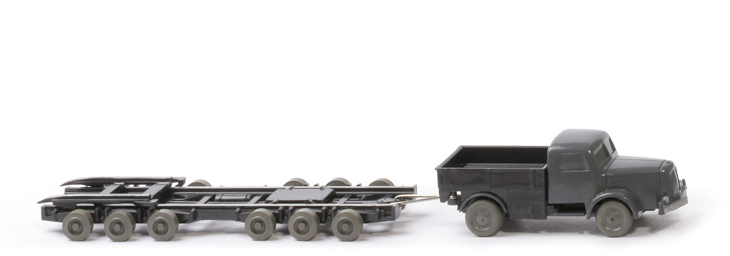 Achsen | Rollachser | | Zugmaschine | Farbe Kabine | dunkelbasaltgrau | Farbe Chassis | dunkelbasaltgrau | Bemalung | Scheinwerfer, Stoßstange | Sattelpfanne | ohne | Chassis | Version 1a | Achshalterungen | geschlossen | Bodenprägung | WM im Kreis | Reserverad | ohne | Pritsche | anthrazit | Ladegut | ohne (nur ohne original) | Räder | 10 mm, mit Profil, staubgrau | | Anhänger Culemeyer | Typ | Gleiskante hoch | Bodenprägung | WMiK, Wiking, Germany, 59 | Farbe | anthrazit | Bremsplatte | anthrazit, glatt, Höhe 1,4mm | Rampe | anthrazit | Bemalung | Gleise silbern | Deichsel | Metall | Räder | Walzenräder 7,8mm o. Profil | Farbe Räder | staubgrau |