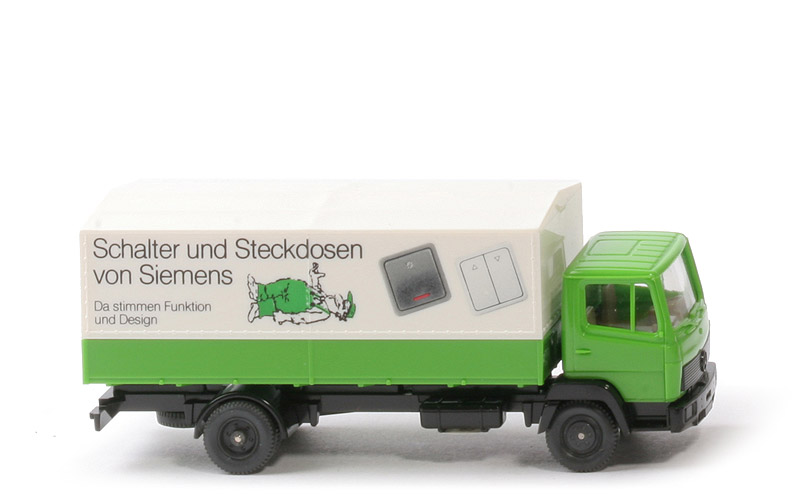 Kabine | gelbgrün | Fensterstrebe | Teil des Verglasung | Grill | schwarz, eingesetzt | Grillbedruckung | ohne | Inneneinrichtung | graubeige, Lkr integriert | Kotflügel, Stoßstange | schwarz | Chassis | schwarz | Kotflügel hinten | schwarz | Bodenprägung | WIKING, Berlin-W | Reserverad | unter Chassis | Pritsche | gelbgrün | Pritscheneinlage | Pappe, silbern | Plane | weiß | Beschriftung Plane Seiten | "Schalter und Steckdosen, ..." | hier Zusatzdruck | Elektrohandwerker, 90° verdreht | Beschriftung Plane hinten | "Siemens, i-center" | Beschriftung | ohne | Räder | 10 mm |