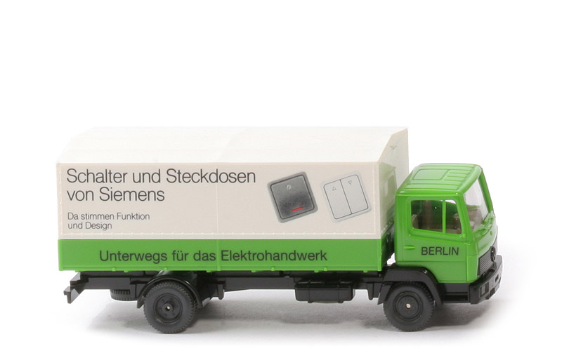 | Kabine | gelbgrün | | Türdruck | "Berlin" | | Fensterstrebe | Teil des Verglasung | | Grill | schwarz, eingesetzt | | Grillbedruckung | ohne | | Inneneinrichtung | graubeige, Lkr integriert | | Kotflügel, Stoßstange | schwarz | | Chassis | schwarz | | Kotflügel hinten | schwarz | | Bodenprägung | WIKING, Berlin-W | | Reserverad | unter Chassis | | Pritsche | gelbgrün | | Pritsche Druck seitlich | "Unterwegs für das Elektrohandwerk" | | Pritsche Druck hinten | "Berlin Brandenburg" | | Pritscheneinlage | Pappe, silbern | | Plane | weiß | | Beschriftung Plane Seiten | "Schalter und Steckdosen, ..." | | Beschriftung Plane hinten | "Siemens, i-center" | | Beschriftung | ohne | | Räder | 10 mm |