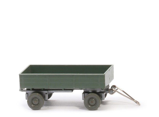 | Pritsche | Pritsche Farbe | dunkelresedagrün | Pritschenseiten | mit Struktur | Pritscheneinlage | silbern | Kennzeichen hinten | einteilig | | Chassis | Chassis Variante | Typ 2 | Chassis Farbe | silbern | Achshalterungen | offen | Drehschemel | eingesteckt | Bodenprägung Drehschemel | WM | Bodenprägung Chassis | ohne | Zughaken | silbern, Typ LKW, unter Chassis geklebt | | weitere Details | Deichsel | Metall | Bemalung Rückleuchten | rot | Bemalung Kennzeichen | ohne | Räder | 10 mm, staubgrau, neuere Ausführung |