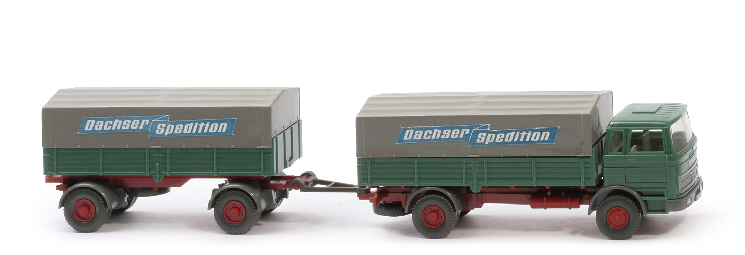 | | Zugwagen | | Kabine oben | helles kieferngrün | | Kabine unten | helles kieferngrün | | Streifen | ohne | | Verglasung | klar | | Inneneinrichtung | ca. lichtgrau | | Lenkrad | ohne | | Stoßstange, Radlauf vorn | basaltgrau | | hier Aussparung | mit | | Chassistyp | Zughaken verstärkt | | Chassisfarbe | hellbraunrot | | Radlauf hinten | basaltgrau | | Reserverad | gesteckt | | Pritsche | helles kieferngrün | | Pritschengestell | hellbraunrot | | Pritscheneinlage | silber | | Plane | olivgrau | | Räder | 12mm, Profil grob | | Felgen | hellbraunrot | | | Anhänger | | Pritsche | helles kieferngrün | | Chassis | hellbraunrot | | Kotflügel | basaltgrau | | Deichsel | Kunststoff | | Reserverad | mittig unter Chassis | | Pritscheneinlage | silbern | | Plane | olivgrau | | Räder | 12mm, Profil grob | | Felgen | hellbraunrot | | | Beschriftung | | Ausführung | ausgestanzte Papieraufkleber (s. Bild) |