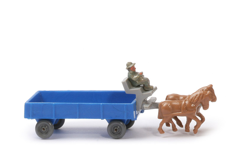 Räder | Drahtachser | Pritschentyp | ohne Querverbretterung | Farbe Pritsche | dunkles signalblau | Deichselrest | mit | Pritschenboden | mit Struktur | Zughaken | integriert, nach unten | Deichsel/Kutschbock | platingrau | Quersteg Deichsel | mit | Farbe linkes Pferd | ockerbraun | Farbe rechtes Pferd | ockerbraun | Kutscher Typ | Hut | Kutscher Farbe | helles hellolivgrün meliert | Kutscher Bemalung | Gesicht, Hände | Räder | glasiges staubgrau |