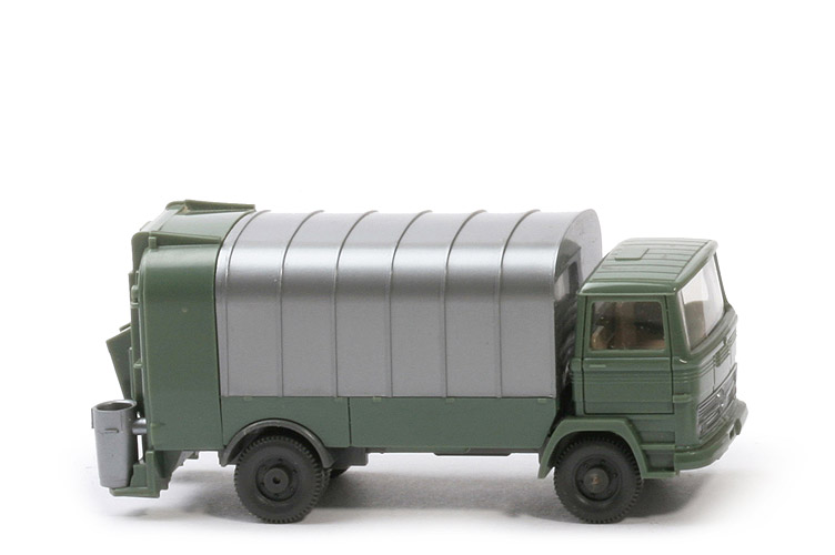 | Kabine | dunkelresedagrün | | Spiegel | ohne | | Grill | silbern mit Stern | | Verglasung | klar | | Inneneinrichtung | ca. hellgelbgrau | | Lenkrad | ohne | | Chassis | staubgrau | | Druckluftbehälter | Hahn schmal | | Radlauf hinten | dunkelresedagrün | | Trommel | silbern | | Trommelunterbau | dunkelresedagrün | | hier Bodenprägung | 64n | | Heckteil des Aufbaus | dunkelresedagrün | | Prägung "KUKA" | mit | | Rückleuchten | erhaben | | Aussparung vor Trittbrett | ohne | | Mülltonnen | 2 gesteckt, silbern | | Beschriftung | ohne | | Bemalung | ohne | | Räder | 11mm, 6 Loch |