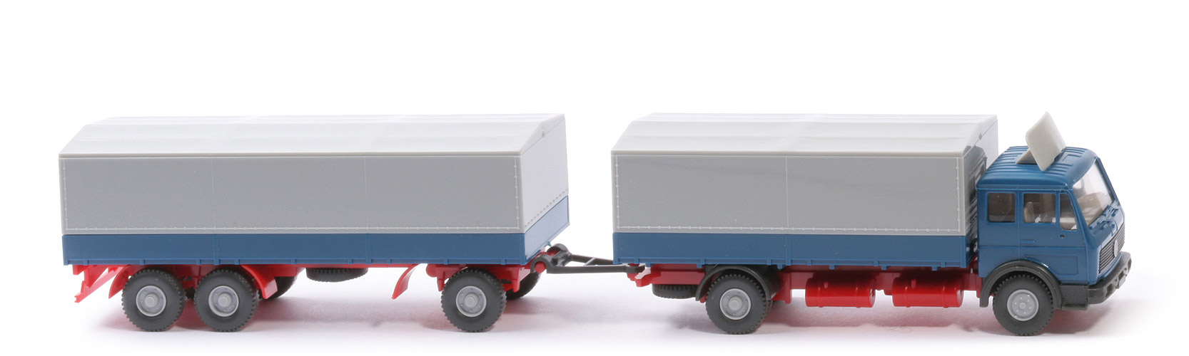| | Zugwagen | | Kabine | capriblau | | eingesetzter Grill | schwarz, ohne Streifen | | Spoiler | silbergrau | | Heckfenster | geschlossen | | Spiegelaufnahmen | mit | | Inneneinrichtung | ca. hellolivgrau | | Stoßstange | anthrazit | | Chassis | rot | | Radlauf hinten | anthrazit | | Reserverad | hinten unter Chassis | | Pritsche | capriblau | | Pritscheneinlage | Pappe, silbern | | Plane | silbergrau | | Beschriftung Plane | ohne | | Beschriftung Pritsche | ohne | | Räder | Profil grob | | Felgen | silbergrau, 6-Loch | | | Anhänger | | Pritsche | capriblau | | Chassis | rot | | Drehschemel | rot | | Doppelachsaggregat | rot | | Pritscheneinlage | Pappe, silbern | | Plane | silbergrau | | Beschriftung Plane | Pönsgen ... (s. Foto) | | Beschriftung Pritsche | ohne | | Räder | Profil grob | | Felgen | silbergrau, 6-Loch | | | Link | | zum Modell mit Druck | Pönsgen |