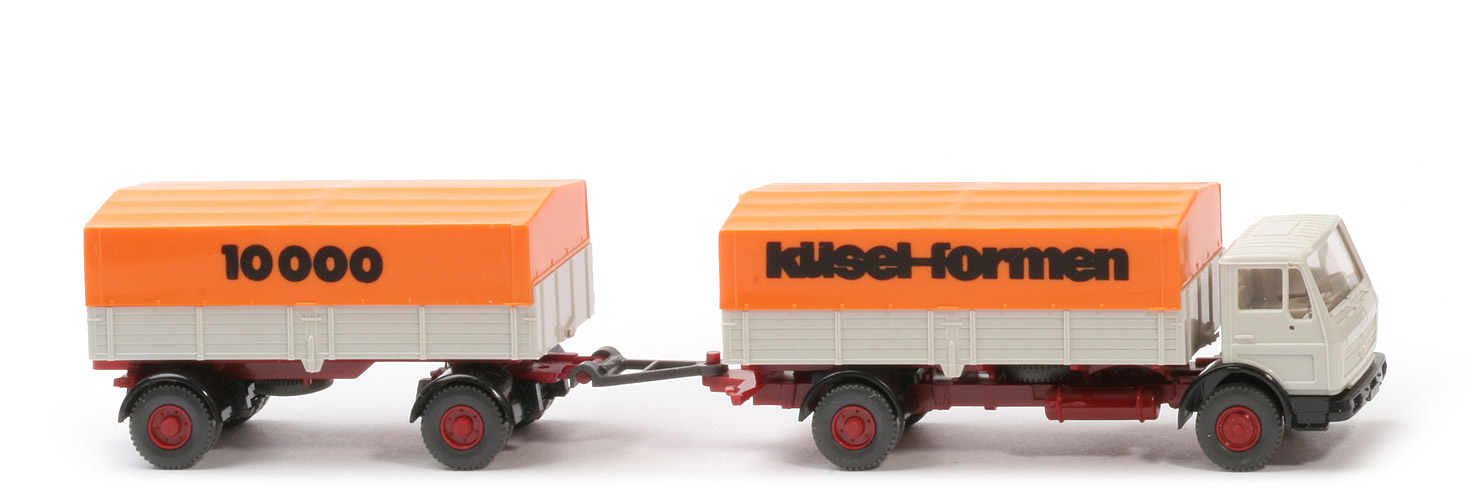 | | Zugwagen | | Kabine | grauweiß | | Spiegelaufnahmen | mit | | Grill | integriert | | Verglasung | klar | | Inneneinrichtung | Lenkrad integriert, ca. graubeige | | Stoßstange, vorderer Kotflügel | schwarz | | Typ vorderer Kotflügel | ohne Wulst | | Scheinwerfer | unbemalt, ohne integrierte Blinker | | Chassistyp | Zughaken auf Dreieck | | Chassisfarbe | hellbraunrot | | Radlauf hinten | schwarz | | Reserverad | mittig unter Prtische | | Pritsche | grauweiß | | Pritschengestell | hellbraunrot | | Pritscheneinlage | lichtgrau | | Plane Farbe | rotorange | | Plane Typ | niedrig, hinten offen, Steckleisten seitlich | | Druck Fahrerseite | "10000" | | Druck Beifahrerseite | "küsel-formen" | | Räder | 12mm, Profil grob | | Felgen | hellbraunrot | | | Anhänger | | Ausführung | wie Zugwagen | | Druck Beifahrerseite | "10000" | | Druck Fahrerseite | "küsel-formen" |