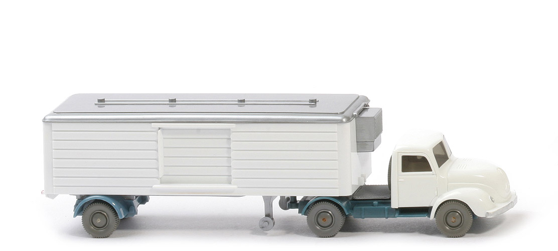 | Zugmaschine | Farbe Kabine | weiß | Version Kabine | Typ 4 | Stoßstange | gerade | Kabinenboden | mit Schlitz | Verglasung | getönt | Chassis Farbe | dunkelgraublau | Chassis Typ | Version 2 | Bemalung | Scheinwerfer, Stoßstange | Sattelpfanne | alt, ohne Steg, für kleinen KöBo | Achshalterungen | geschlossen | Bodenprägung | WM (ohne Kreis) | Reserverad | hinter Kabine | Räder | 10 mm, neuere Ausführung | | Auflieger | Dach | silber | Aufbau | weiß | Bodenprägung Aufbau | Wiking Modell, MiG, 52, Viking Model | Kühlaggregat | silber | Radlauf | mattgraublau | Achshalterungen | offen | Chassis | silber | Stützrollen | silber | Königzapfen | dünn, mittig auf Platte | Bodenprägung Chassis | WM hinter KöBo | Räder | 10 mm, neuere Ausführung |