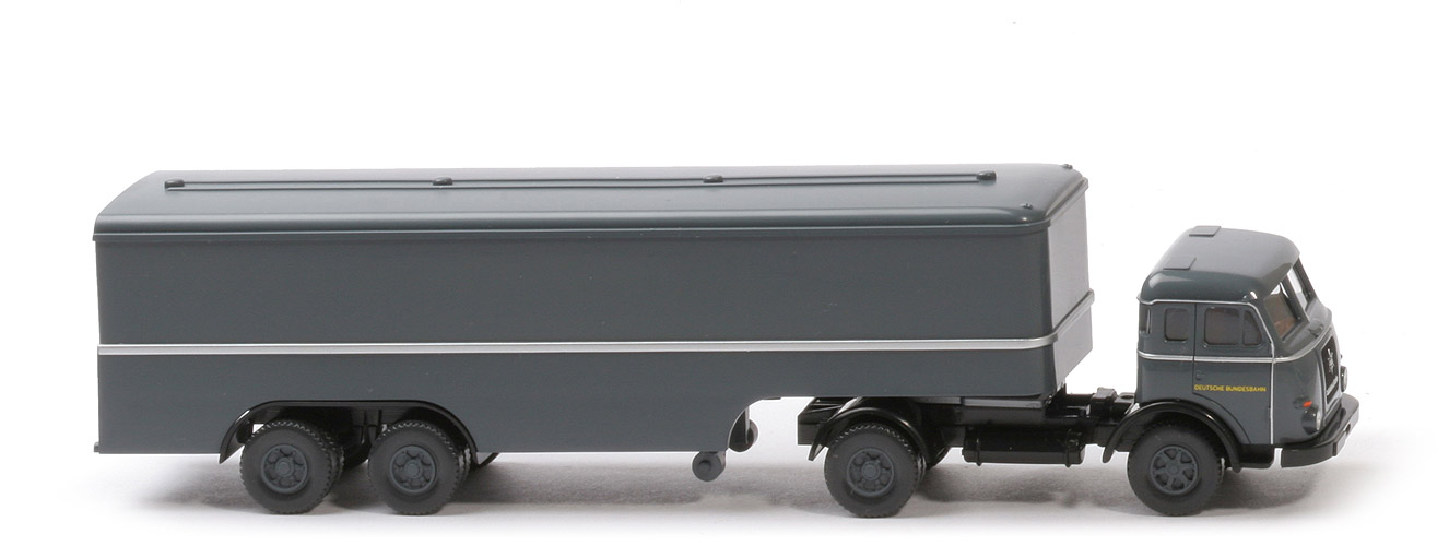 In recht tristem Grau, aber mit eigenem Charme. Die offizielle Farbangabe "eisengrau" findet sich nicht in der Farbkarte von Herrn Wanner. Dort ähnlich: basaltgrau. Bedruckung recht aufwändig: waagerechte und senkrechte Zierleisten der Kabine in silbern, Frontdruck DB-Keks in weiß, Blinker orange, Rückleuchten an Zugmaschine und Auflieger in rot. Goldener Türdruck der Kabine "Deutsche Bundesbahn". |