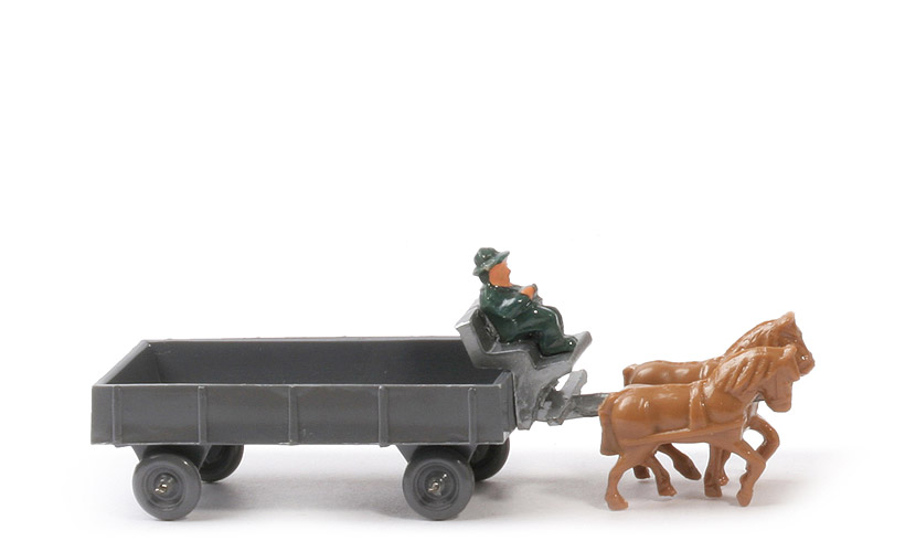 | Räder | Drahtachser | | Pritschentyp | ohne Querverbretterung | | Farbe Pritsche | basaltgrau | | Deichselrest | ohne | | Pritschenboden | mit Struktur | | Zughaken | ohne | | Deichsel/Kutschbock | silbern | | Quersteg Deichsel | mit | | Farbe linkes Pferd | ockerbraun | | Farbe rechtes Pferd | ockerbraun | | Kutscher Typ | Hut | | Kutscher Farbe | ca. kieferngrün uni | | Kutscher Bemalung | Gesicht, Hände | | Räder | basaltgrau |