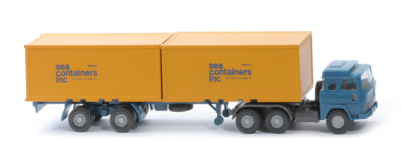 Liliput-Container sind Container, die von Liliput als Ladegut verwendet wurden. Sie wurden nicht in Kombination mit WIKING-Sattelzügen angeboten. Diese Kombinationen sind also keine originalen WIKING-Modelle. sea container (Liliput) lackiert. Hier auf einem Magirus-235-Zug.Beachte: Druck beim vorderen Container mittig, beim hinteren nach hinten versetzt. |