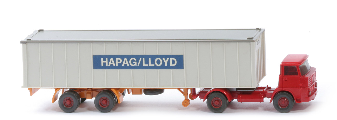 | Zugmaschine | Kabine oben | rot | Kabine unten | rot | Verglasung | getönt | Chassistyp | alt | Zughaken | mit | Fläche hinter Sattelpfanne | geriffelt | Chassisfarbe | rot | Sattelpfanne | neu, für dünnen Bolzen | Reserverad | flach hinter Kabine | Räder | 12mm, Profil fein | Felgen | hellbraunrot | | Container | Art | 1 x 40 ft, gerippt | Dach | betongrau | Korpus | perlweiß | Türen | perlweiß | Unterkante | schmal | Beschriftung | Hapag-Lloyd (s. Foto) | Beschriftung Grösse | 7 Felder, Papieraufkleber | | Auflieger | Farbe | gelborange (Werbe) | Unterfahrschutz | ohne | Königsbolzen | dünn | Räder | 12mm, Profil fein | Felgen | hellbraunrot |