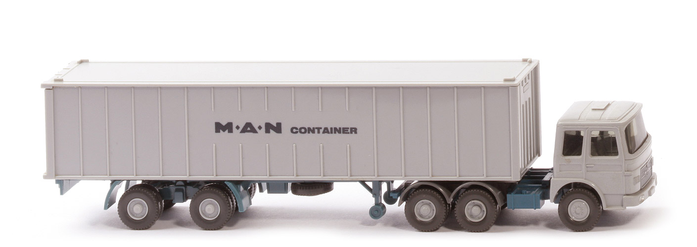 | Zugmaschine | Fahrerhaus | silbergrau | Verglasung | getönt | Inneneinrichtung | ohne Lenkrad | Spiegel | keine | Scheibenwischer | keine | Lüftergitter | mit | Grill | silbern, ohne Löwe | Motorblock | silbern | Chassis | azurblau | Radlauf hinten | 2-teilig, basaltgrau | Räder | 12mm, Profil grob | Felgen | silbergrau | | Container | Typ | 40 ft, gerippt | Farbe Dach | silbergrau | Farbe Korpus | silbergrau | Farbe Türen | silbergrau | untere Kante | breit | Beschriftung | M A N Container | Beschriftungsart | Druck schwarz | | Auflieger | Bolzen | stark | Unterfahrschutz | ohne | Farbe | azurblau | Räder | Profil grob | Felgen | silbergrau |