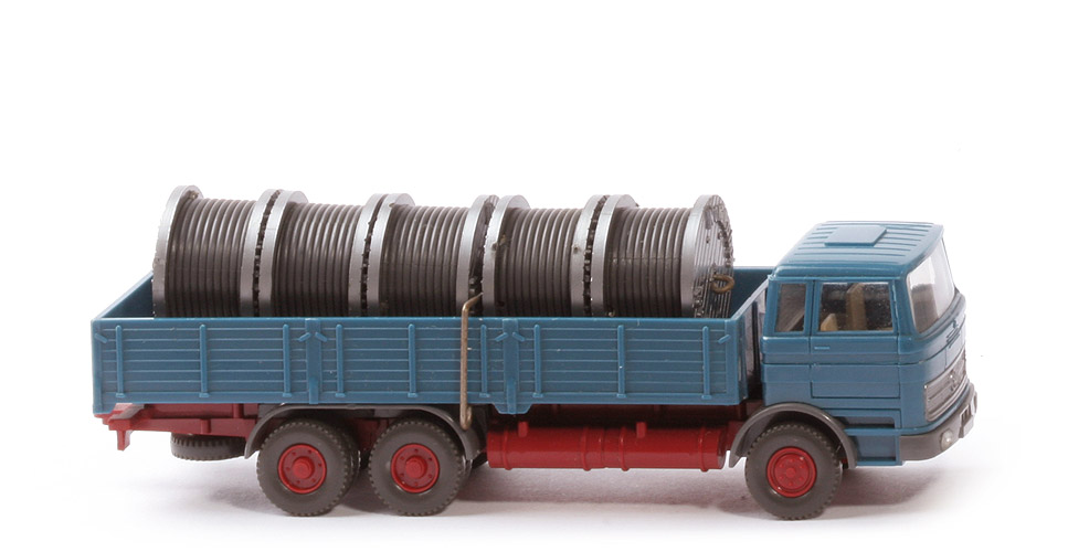 | Fahrzeug | Kabine oben | azurblau | Kabine unten | azurblau | Streifen | ohne | Verglasung | klar | Inneneinrichtung | creme (!) | Lenkrad | ohne | Stoßstange, Radlauf vorn | basaltgrau | Chassisfarbe | weinrot | Radlauf hinten | basaltgrau, 1-teilig | Reserverad | unter Chassis gesteckt | Pritsche | azurblau | Pritscheneinlage | lichtgrau | Räder | 12 mm, Profil grob | Felgen | hellbraunrot | | Kabel | Halterung | Metallklammer | Prägung | Nordkabel | Kabelrolle | silbern | Kabel | anthrazit |