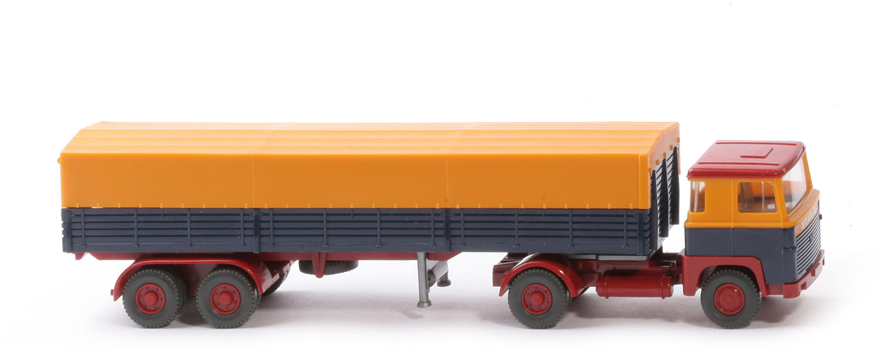 | Zugmaschine | Dach | hellbraunrot | Kabine oben | melonengelb | Kabine unten | stahlblau | Stoßstange | hellbraunrot | Frontbeschriftung | SCANIA schmal | hier Farbhinterlegung | melonengelb | Grill Prägung | mit 110 | Scheinwerfer | in der Stoßstange ungesilbert | Spiegel | ohne | Scheibenwischer | ohne | Lenkrad | ohne | Sattelpfanne | für großen Königsbolzen | Reserverad | ohne | Chassis Farbe | hellbraunrot | Rücklichtstangen | ohne | Räder | 12 mm, Profil grob | Felgen | hellbraunrot | | Auflieger | Farbe Pritsche | stahlblau | Pritschentyp | Holzpritsche mit Lasche | Chassis | rubinrot | Pritscheneinlage | lichtgrau | Achseinheit | rubinrot | Bodenprägung Achseinheit | Germany/ Wiking | Reserverad | ja | Stütze | starr, Stempel silbern | Plane | melonengelb | Plane Art | Seite 2 Mark., vorne geschl. | Beschriftung | keine | Räder | 12 mm, Profil grob | Felgen | hellbraunrot |