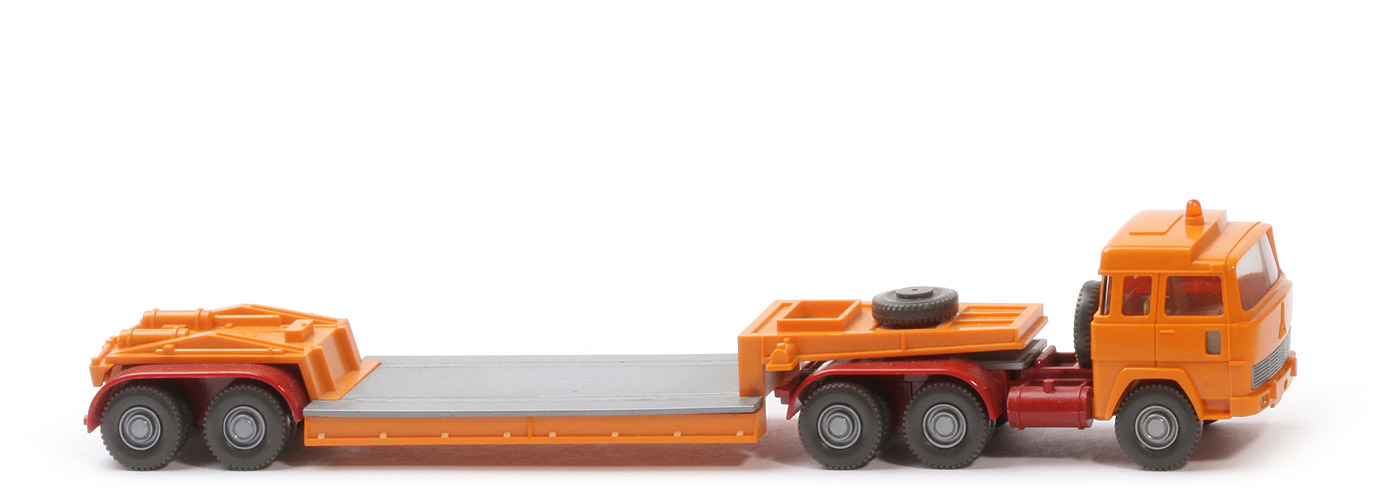 | Zugmaschine | Kabine oben | gelborange | Kabine unten | gelborange | Gelblicht | mit | Verglasung | klar | Inneneinrichtung | ca. hellgelbgrau | Lenkrad | ohne | Grill | silber | Scheinwerfer | bemalt | Chassis | hellbraunrot | Radlauf hinten | hellbraunrot, 1-teilig | Sattelpfanne | für großen Königsbolzen | Reserverad | hinter Kabine | Räder | 12mm, Profil grob | Radkappen | silbern | | Auflieger | Aufbau | gelborange | Pritscheneinlage | silbern, ohne Dorn | Achseinheit | Klemmplatte | Achseinheit - Farbe | hellbraunrot | Werkzeugkasten vorne | ohne Inhalt | Reserverad | über Drehschemel | Bodenprägung Aufbau | nur Wiking Germany | Rückleuchten am Aufbau | keine | Räder | 12mm, Profil grob | Radkappen | silbern |