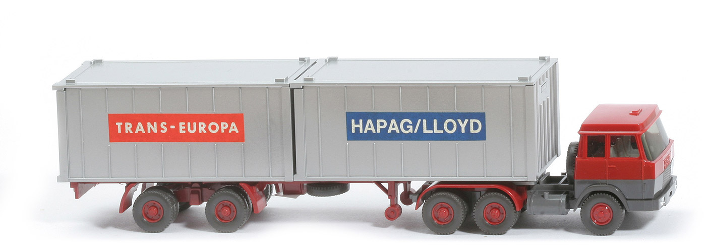 | Zugmaschine | Kabine oben | hellbraunrot | Kabine unten | anthrazit | Verglasung | getönt | Inneneinrichtung | ca. hellgelbgrau | Lenkrad | ohne | Chassis | basaltgrau | Radlauf hinten | hellbraunrot, einteilig | Sattelpfanne | für großen Königsbolzen | Reserverad | hinter Kabine | Räder | Profil grob | Felgen | hellbraunrot | | Container | Art | 2 x 20 ft gerippt | Farbe | helles silber (!!!) | Beschriftung | Hapag-Lloyd u. Trans-Europa | Beschriftung Art | 5 Felder, Papieraufkleber | | Auflieger | Farbe | hellbraunrot (!!!) | Unterfahrschutz | ohne | Königsbolzen | stark | Räder | Profil grob | Felgen | hellbraunrot |