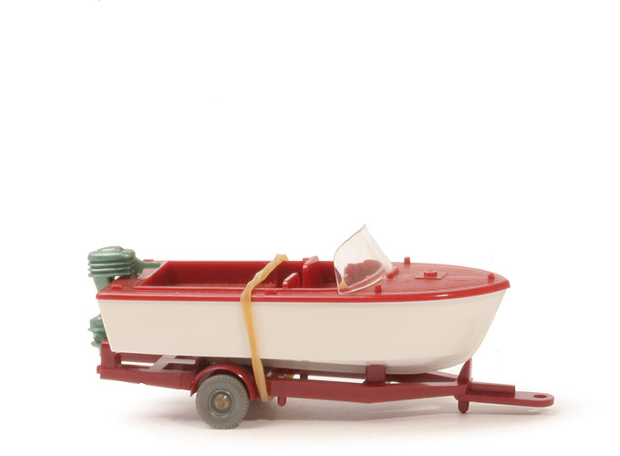 | | Boot | | Bootoberseite | weinrot | | Vordersitze | ohne Verbindungssteg | | Windschutzscheibe | groß (ca. 7 mm hoch) | | Lenkrad | ca. elfenbein, 3-speichig | | Fußraum (Deck) | silbern | | hier Prägung | WM | | Außenborder | grünmetallic | | Rumpf | weiß | | | Anhänger | | Farbe | braunrot | | Version | Typ 1 (mit zwei runden Stiften) | | Nestkennung | "3" | | Bodenprägung | Wiking Germany | | Befestigung Boot | per Gummi | | Räder | ca. betongrau, Nabe gewölbt |