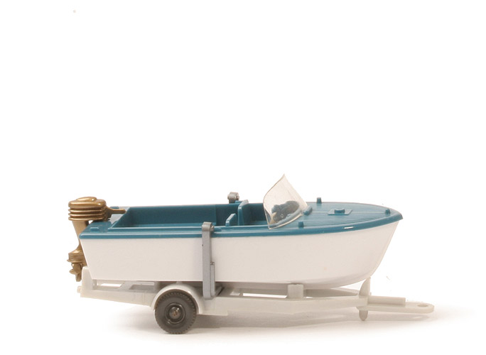 | Boot | Bootoberseite | azurblau | Vordersitze | ohne Verbindungssteg | Windschutzscheibe | groß (ca. 7 mm hoch) | Lenkrad | ca. achatgrau, 3-speichig | Fußraum (Deck) | silbern | hier Prägung | WM | Außenborder | goldmetallic | Rumpf | weiß | | Anhänger | Farbe | altweiß | Version | Typ 2 (mit Schlitz für Kunststoffhalterung) | Nestkennung | "1" | Bodenprägung | Wiking Germany | Befestigung Boot | per Kunststoffhalterung - silbern | Räder | anthrazit, Nabe gewölbt |