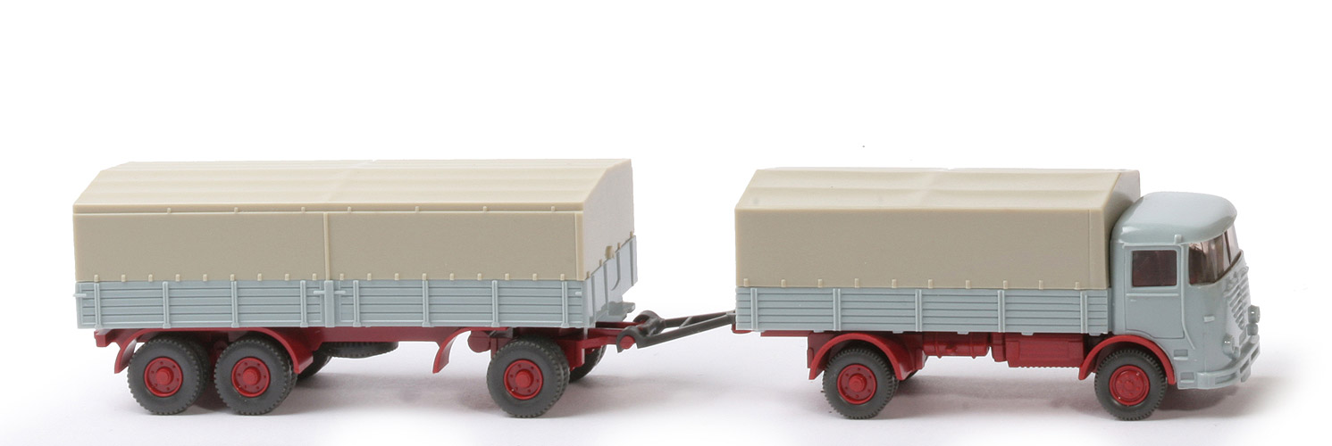 | Zugwagen | Aufbau | Typ 2, hellblaugrau | Chassis | Typ 6, hellbraunrot, m. Zughakenverstärkung | Verglasung | Typ 3, leicht getönt | Fahrer | ohne | Blinker | mit | Bemalung | Version 6: völlig ohne | Chassistyp | hinten geschlossen, mit "Germany" | Zughaken | verstärkt | Verdeck | hellgelbgrau | Räder | 11mm, Felgen eingesetzt | Felgen | 6-Loch, hellbraunrot | | Anhänger | Pritsche | hellblaugrau | Pritscheneinlage | ca. lichtgrau | Chassis | hellbraunrot | Hinterachsaufhängung | für Doppel-Bereifung | Bodenprägung | Berlin-W | Drehschemel | für Doppel-Bereifung, eingesteckt | Bodenprägung Drehschemel | 40d | Reserverad | mittig unter Chassis gesteckt | Deichsel | Kunststoff anthrazit | Plane | hellgelbgrau | Innenprägung | WM ohne Kreis | Räder | 12 mm, Felgen eingesetzt | Felgen | 6-Loch, hellbraunrot |