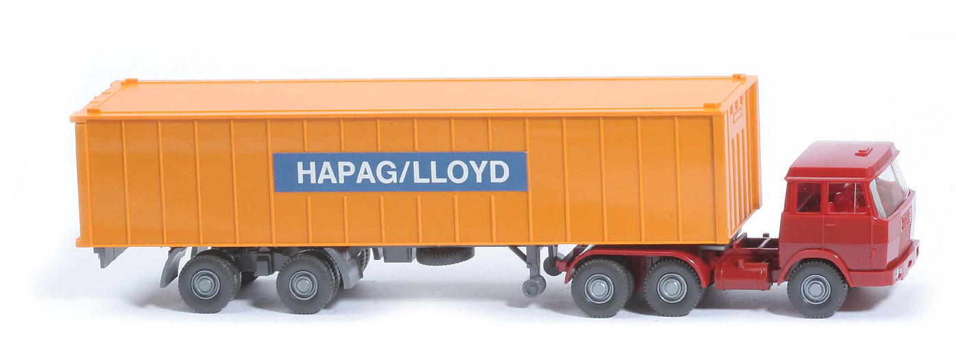 | Zugmaschine | Kabine oben | hellbraunrot | Kabine unten | hellbraunrot | Verglasung | klar | Inneneinrichtung | 3 Sitze, rot | Lenkrad | ohne | Chassis | hellbraunrot | Radlauf hinten | hellbraunrot, einteilig | Sattelpfanne | für großen Königsbolzen | Reserverad | ohne | Räder | Profil grob | Radkappen | silber | | Container | Art | 1 x 40 ft gerippt | Farbe | gelborange | Unterkante | schmal | Beschriftung | Hapag-Lloyd (s. Foto) | Beschriftung Art | 7 Felder, Papieraufkleber | | Auflieger | Farbe | basaltgrau | Unterfahrschutz | ohne | Königsbolzen | stark | Räder | Profil grob | Radkappen | silber |