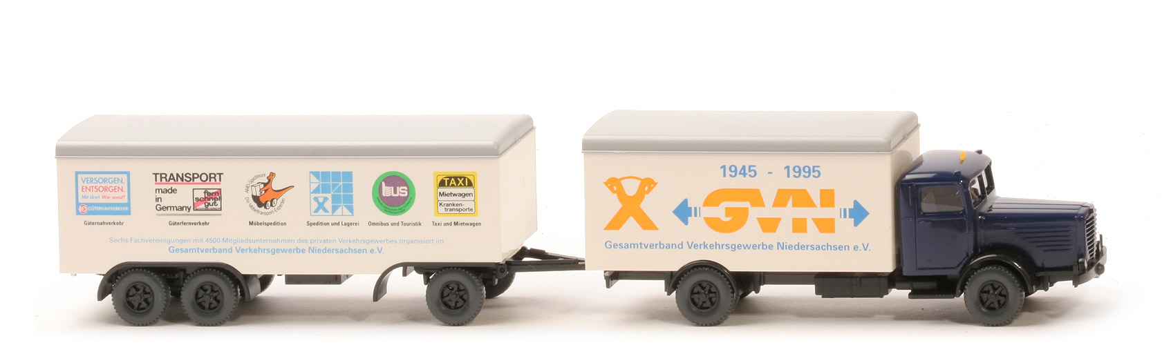 | Zugwagen | Kabine | dunkelultramarin | Verglasung | klar | Inneneinrichtung | ca. lichtgrau | Lenkrad | separat eingesetzt, silbern | Bedruckung Scheinwerfer | silbern | Bedruckung Grill | silbern | Warndreieck | gelb | Chassis Farbe | schwarz | Chassis Typ | fein detailliert, durchbrochen | Bodenprägung | neues WIKING-Logo, Germany | Zughaken | klein | Reserverad | auf Chassis | Bedruckung Rückleuchten | ohne | Koffer Korpus | weiß | Koffer Türen | weiß | Dach | silbergrau | | Anhänger | Koffer Korpus | weiß | Koffer Türen | weiß | Dach | silbergrau | Chassis | schwarz | Drehschemel | schwarz | Deichsel | Öse dünn | | Bedruckung | Koffer | "GVN", ... (siehe Foto) | | Räder | Typ | 12 mm, Felgen eingesetzt | Felgen | Trilexfelgen, schwarz |