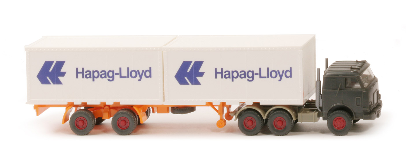 | Zugmaschine | Kabine | anthrazit | Kabinen-Unterteil | anthrazit | Verglasung | klar | Inneneinrichtung | ca. hellolivgrau | Auspuffrohre | 2, silber | Chassis | zementgrau | Radlauf hinten | zementgrau | Sattelpfanne | für großen Königsbolzen | Reserverad | ohne | Räder | Profil grob | Felgen | hellbraunrot | | Container | Art | Glattwand | Farbe | weiß | Türen | alt | Beschriftung | Hapag-Lloyd (s. Foto) | Beschriftung Art | 36mm, ohne Nummer (Werbe) | | Auflieger | Farbe | orangegelb | Unterfahrschutz | ohne | Königsbolzen | stark | Räder | Profil grob | Felgen | hellbraunrot |