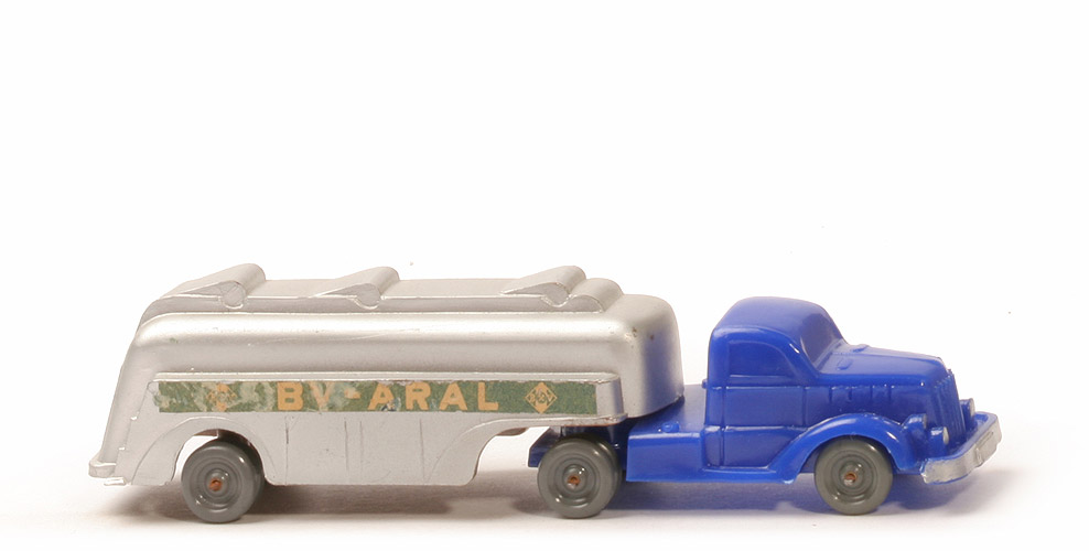 | Achsen | Drahtachser | | | Zugmaschine | | Farbe | ultramarin | | Bemalung | Scheinwerfer, Kennzeichen silbern | | Bodenprägung | keine | | Reserverad | ohne | | Räder | 9 mm, ca. basaltgrau | | | Auflieger | | Achsen | Drahtachser | | Farbe | silbern lackiert | | Grundfarbe Aufbau | ockerbraun | | Farbe Chassis | ockerbraun | | Beschriftung | BV-Aral (s. Foto) | | Beschriftung Art | Nassschieber | | Bodenprägung | ohne | | Räder | 9 mm, ca. basaltgrau |