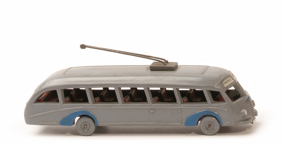 Achsen | Drahtachser | Farbe Aufbau | staubgrau | Fenster | durchbrochen | Stromabnehmer | 2 Metallbügel auf grau lackierter Holzplatte | Dachreling | mit | Gepäckbrücke | ohne | Inneneinrichtung | dunkelrot lackiert | Bemalung Front | Zielschilder, Scheinwerfer weiß | Bemalung Radkästen | blau lackiert | Bemalung Heck | Rückleuchte rot getupft, Kennzeichen weiß | Rückleuchte | ohne | Reserverad | ohne | Beschriftung | ohne | Chassis | ca. staubgrau | Bodenprägung | WM / Made in Germany | Räder | ca. staubgrau |