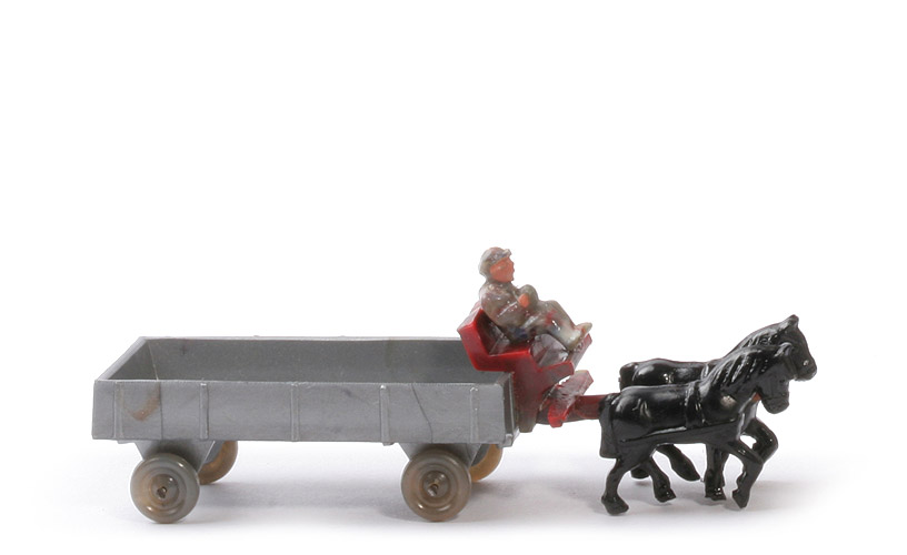 Räder | Drahtachser | Pritschentyp | ohne Querverbretterung | Farbe Pritsche | silbern | Deichselrest | mit | Pritschenboden | glatt | Zughaken | ohne | Deichsel/Kutschbock | mischrot | Quersteg Deichsel | mit | Farbe linkes Pferd | schwarz | Farbe rechtes Pferd | schwarz | Kutscher Typ | Mütze | Kutscher Farbe | ca. steingrau misch | Kutscher Bemalung | Gesicht, Hände | Räder | glasiges felsgrau |