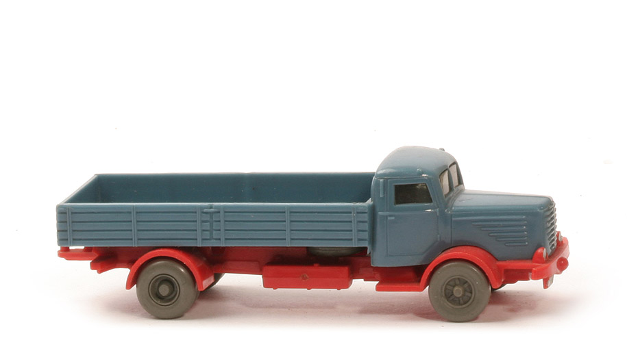 Sehr frühe Version mit Rädern ohne Profil. Solche Räder gibt es z.B. beim unverglasten Krupp Titan. Die hier an der Vorderachse montierten Trilexfelgen gibt es allerdings sonst nur an der Hinterachse. An der Hinterachse sind beim vorliegenden Modell jeweils außen die breiteren Räder des 3-Achs-Anhängers verbaut. Hier ein Link zum Titan zum Vergleichen. |