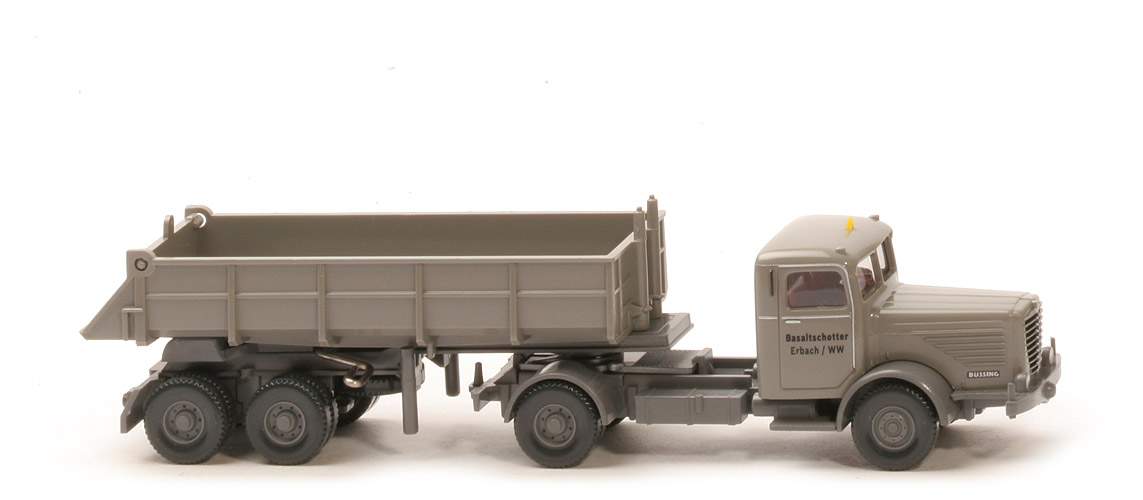 | Zugmaschine | Kabine | steingrau | Verglasung | klar | Inneneinrichtung | ca. weinrot, Lkr integriert | Bedruckung Scheinwerfer | silbern | Bedruckung Grill | Büssing-Spinne silbern, schwarz hinterlegt | Warndreieck | gelb | Türdruck | "Basaltschotter Erbach / WW." | Chassis Farbe | staubgrau | Sattelpfanne | für großen Königsbolzen, mit Griff, ähnlich | Bodenprägung | neues WIKING-Logo, Germany | Zughaken | klein | Reserverad | ohne | Räder Typ | 12 mm, Profil grob | Felgen | 8-Loch, staubgrau | | Auflieger | Farbe Mulde und Klappe | steingrau | Farbe Chassis | staubgrau | Bodenprägung Chassis | neues WIKING-Logo, Germany | Farbe Scharnierhalterung | staubgrau | Farbe Achshalterung | staubgrau | Bodenprägung Achshalterung | 67 s | Königsbolzen | stark | Reserverad | unter Chassis | Räder Typ | 12 mm, Profil grob | Felgen | 8-Loch, staubgrau |