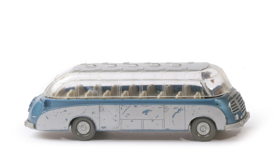 Karosserie Typ | Serie | Karosserie Farbe | blaumetallic | Schlitze für Dach | lang und breit | Armaturenbrett | trapezförmig | Gestaltung Zierline Front | mit Punkt, gesilbert | Boden Fahrgastraum | mit Struktur | Gestaltung Seite | Schablonierung silber, starke Macken | Fahrersitz Farbe | hellgelbgrau | Sitzreihen | hellgelbgrau, gesteckt | Fahrer Typ | groß, mit Mütze | Fahrer Farbe | ca. basaltgrau | Lenkrad Typ | klein, zwei Speichen | Lenkrad Farbe | hellgelbgrau | Dach Befestigung | gesteckt | Dach Gestaltung oben | glatt, Schablonierung silbern, mit Macken | Dach Typ Haltenasen | lang und breit | Chassis Farbe | hellgelbgrau | Chassis Typ | Typ 2 | Achshalterungen hierbei | geschlossen | Bodenprägung hierbei | WM im Kreis | Bemalung Hauptscheinwerfer | silber | Bemalung Nebelscheinwerfer | silber | Bemalung Grill und Zierlinie | silber | Bemalung Stoßstangen | silber | Bemalung Rückleuchten | rot | Bemalung Blinker hinten | rot | Bemalung Kennzeichen hinten | silber | Bemalung 3 Zierlinien hinten | silber | Bemalung Lüfter | ohne | Räder Typ | Trilex Bus, mit Profil | Räder Ausführung | staubgrau, Felgen gesilbert |