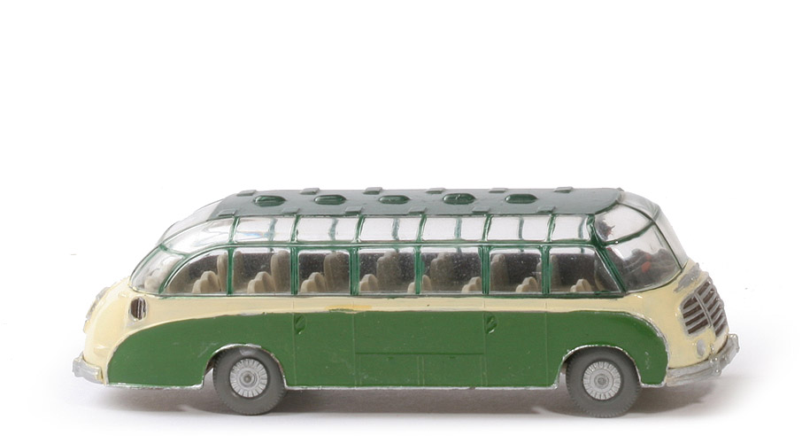 Karosserie Typ | Serie | Karosserie Farbe | braunmetallic, bemalt cremeweiß/grün | Schlitze für Dach | lang und breit | Armaturenbrett | trapezförmig | Gestaltung Zierline Front | mit Punkt, gesilbert | Boden Fahrgastraum | mit Struktur | Gestaltung Seite | Schablonierung silber | Fahrersitz Farbe | hellgelbgrau | Sitzreihen | hellgelbgrau, gesteckt | Fahrer Typ | groß, mit Mütze | Fahrer Farbe | ca. zementgrau | Lenkrad Typ | groß, zwei Speichen | Lenkrad Farbe | basaltgrau | Dach Befestigung | gesteckt | Dach Gestaltung oben | glatt, Fensterstreben und mittig grün bemalt | Dach Typ Haltenasen | lang und breit | Chassis Farbe | hellgelbgrau | Chassis Typ | Typ 2 | Achshalterungen hierbei | geschlossen | Bodenprägung hierbei | WM im Kreis | Bemalung Hauptscheinwerfer | silber | Bemalung Nebelscheinwerfer | silber | Bemalung Grill und Zierlinie | silber | Bemalung Stoßstangen | silber | Bemalung Rückleuchten | rot | Bemalung Blinker hinten | rot | Bemalung Kennzeichen hinten | silber | Bemalung 3 Zierlinien hinten | silber | Bemalung Lüfter | silber | Räder Typ | Trilex Bus, mit Profil | Räder Ausführung | staubgrau, Felgen gesilbert |