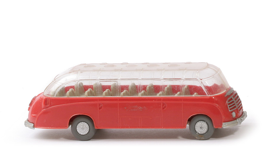 Karosserie Typ | Serie | Karosserie Farbe | rosé | Schlitze für Dach | lang und schmal | Armaturenbrett | trapezförmig | Gestaltung Zierline Front | mit Punkt, gesilbert | Boden Fahrgastraum | mit Struktur | Gestaltung Seite | Schablonierung silber | Fahrersitz | nicht vorhanden | Sitzreihen | hellgelbgrau, gesteckt | Fahrer Typ | ohne | | Lenkrad | Dach Befestigung | gesteckt | Dach Gestaltung oben | mattiert | Dach Typ Haltenasen | lang und dünn | Chassis Farbe | hellgelbgrau | Chassis Typ | Typ 3a | Achshalterungen hierbei | offen | Bodenprägung hierbei | WM ohne Kreis | Bemalung Hauptscheinwerfer | silber | Bemalung Nebelscheinwerfer | ohne | Bemalung Grill und Zierlinie | silber | Bemalung Stoßstangen | silber | Bemalung Rückleuchten | ohne | Bemalung Blinker hinten | ohne | Bemalung Kennzeichen hinten | ohne | Bemalung 3 Zierlinien hinten | ohne | Bemalung Lüfter | silber | Räder Typ | Trilex Bus, mit Profil | Räder Ausführung | staubgrau, Felgen gesilbert |