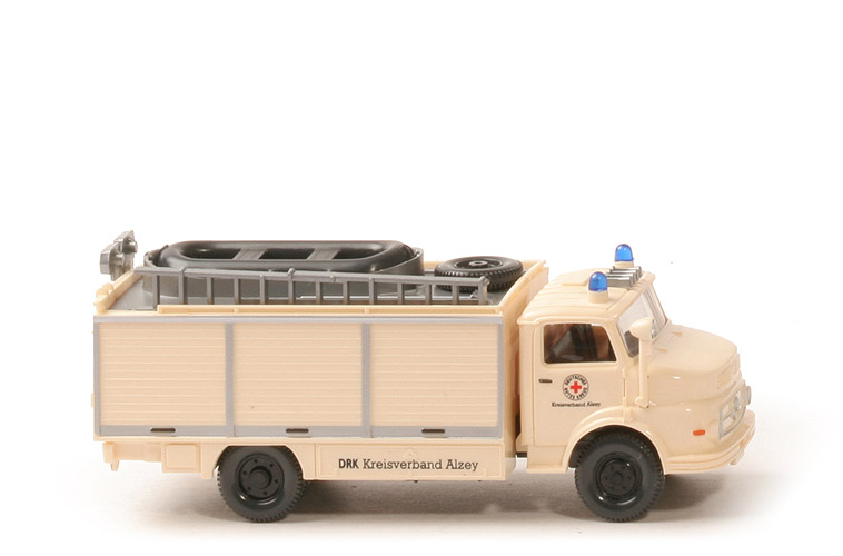 Lechtoys Edition 18 in Podestschachtel "MB L 1413 Rüstwagen Deutsches Rotes Kreuz". Auflage 500. Aufwändig bedrucktes Modell: Scheinwerfer, Grillumrandung, Stern, Zierliene, Umrandungen der Jalousien silbern. Blinker vorne orange, Rückleuchten rot, Griffe der Türen und Jalousien schwarz. Türdruck DKR-Logo und "Kreisverband Alzey" und am Aufbau ebenso "DRK Kreisverband Alzey". Ein Foto des Vorbilds auf der Podestschachtel zeigt, wie nahe das Modell in Farbe und Ausführung dem Original ist. |