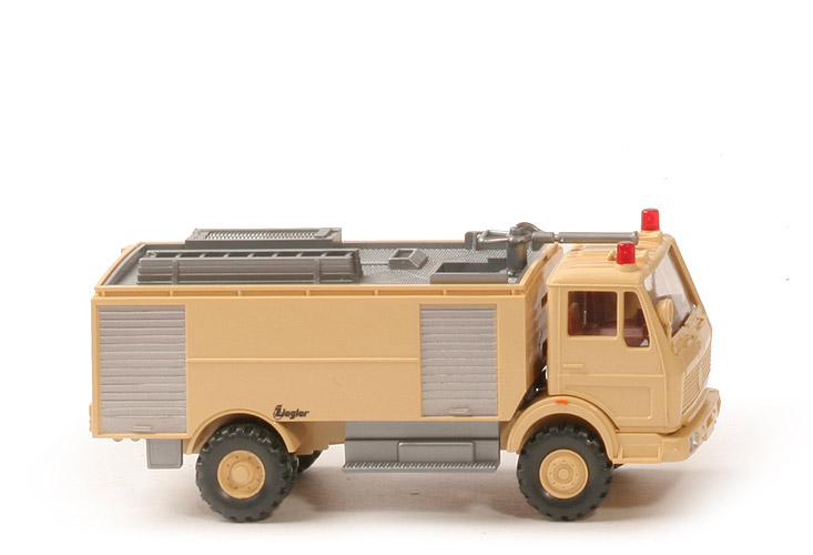 Kabine | dunkles hellbeige | Spiegelaufnahmen | ohne | Grill | dunkles hellbeige, eingesetzt | Typ Grill | ohne Zierlinie, Stern silber eingedruckt | Dach | mit zwei Warnlichtaufnahmen, Fanfaren | Verglasung | klar | Warnlichter | orangetransparent | Inneneinrichtung | Lenkrad integriert, dunkles rostbraun | Suchscheinwerfer | dunkles hellbeige | Stoßstange, vorderer Kotflügel | dunkles hellbeige | Typ vorderer Kotflügel | mit Wulst, mit Bilnker | Scheinwerfer | gesilbert | Aufbau | dunkles hellbeige | Dach Aufbau | silbern | Löschkanone | silbern | Bodengruppe Aufbau | silbern | Bodengruppe Typ | mit Tank u. Luftbehälter | Kotflügel hinten | dunkles hellbeige | Chassis | dunkles hellbeige | Bodenprägung Chassis | WIKING, Germany | Bedruckung Jalousien | silber | Räder | 12 mm, grobstollig, Felgen eingesetzt | Felgen | dunkles hellbeige |