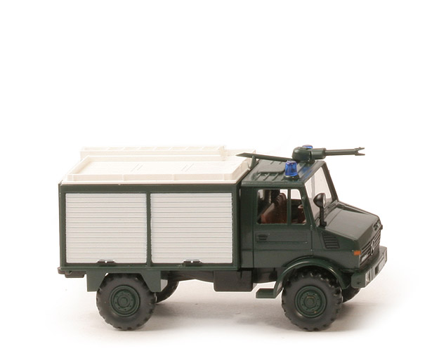 Lechtoys Edition 4 in Podestschachtel "Unimog U 1300 L SLF 1200/1500 Bundespolizei - Flieger- staffel". Auflage 500. Türgriffe und seitliche Luftgitter schwarz, vorne Stern und "Unimog" silbern. Blinker vorne orange, Rückleuchten rot, Druck Kennzeichen nur vorne mit "BP 42 - 301" |
