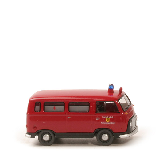 Sagenhaft detaillierte Bedruckung! Alle Fensterrahmen und Scheibenwischer schwarz, alle Griffe silbern. Ein Rotkreuz auf dem Dach (rot auf weiß) und drei Rotkreuze auf den mattierten Scheiben hintenrum. Unglaublich grazile Bedruckung vorne "Taunus" (Ford-Logo) "Transit", Heck "Taunus - Transit" und Türen "Feuerwehr Lübeck" (Logo) "Krankentransportdienst".