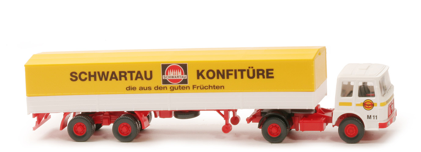 | Zugmaschine | Fahrerhaus | weiß | Verglasung | klar | Inneneinrichtung | ca. anthrazit, mit Lenkrad | Spiegel | mit | Scheibenwischer | mit | Lüftergitter | ohne | Grill | rot, mit Löwe, Rand, Schrift, Löwe silbern | Motorblock | rot | Chassis | rot | | Auflieger | Art | 4-fach-Teilung | Farbe Pritsche | weiß | Pritsche Bodenprägung | Wiking, Germany | Pritscheneinlage | Pappe, silbern | Plane | gelb | Druck Plane seitlich | "Schwartau Konfitüre" ... (s. Foto) | Druck Plane hinten | Schwartau-Logo | Chassis | rot, BP neues WIKING-Logo | Stützen | als Rollen | Doppelachsaggregat | wie Containertrailer | Kotflügel | am Aufliegerchassis, gerundet | Heck | gerade | Warndreiecke | auf Unterfahrschutz | Räder | 12mm, Profil grob | Felgen | 8 mm, rot |
