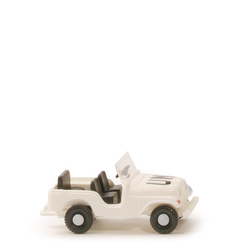 Farbe Karosserie | weiß | Frontscheibe | klar transparent, eingeklebt | Lenkrad | schwarz, 3-speichig | Sitze vorne | schwarz | Reserverad | ohne | Sitzbank hinten | schwarz | Ladung | ohne | Chassis Farbe | weiß | Verstärkung vor Hinterachse | mit | Zughaken | integriert, Mikro-Zapfen | Bodenprägung | neues WIKING-Logo und WM | Benzinkanister | ohne | Bedruckung Haube | "UN" schwarz | Bedruckung Front | links Flagge Kanada rot, rechts "United Nations" hellblau | Bedruckung Scheinwerfer | silber | Bedruckung Rückleuchten | rot | Räder Typ | 8 mm, Profil grob | Räder Farbe | Druck weiß |