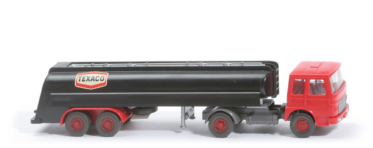 | Zugmaschine | Fahrerhaus | rot | Verglasung | klar | Inneneinrichtung | ohne Lenkrad | Spiegel | keine | Scheibenwischer | keine | Lüftergitter | mit | Grill | silbern, ohne Löwe | Motorblock | silbern | Chassis | staubgrau | Räder | 12mm, Profil grob | Felgen | hellbraunrot | | Auflieger | Tank | schwarz durchgefärbt | Leiter | nicht gesilbert | Farbe Chassis, Armaturen | silber | Bodenprägung | nur Wiking (ohne 80S) | Beschriftung Seite | Texaco | Beschriftung Art | Abziehbild | Beschriftung Heck | Texaco | Beschriftung Art | Abziehbild | Achseinheit - Farbe | rot | Achseinheit - Variante | Klemmplatte | Reserverad | gesteckt | Räder | 12mm, Profil grob | Felgen | hellbraunrot |